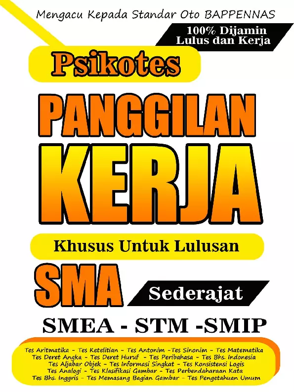 Sinopsis Buku: Buku ini merupakan panduan lengkap dan praktis untuk mempersiapkan diri menghadapi tes psikotes yang biasa digunakan oleh HRD dalam proses rekrutmen karyawan. Terdapat berbagai jenis soal yang sering muncul dalam tes psikotes, seperti tes analogi, tes pribahasa, tes bahasa Inggris, tes klasifikasi gambar, tes bahasa Indonesia, tes antonim, tes deret angka, tes informasi singkat, tes konsistensi logis, tes sinonim, tes matematika, tes perbendaharaan kata, tes ketelitian, tes objek gambar, tes aritmatika, tes deret huruf, tes memasang bagian gambar, dan lain sebagainya. Setiap bagian dalam buku dilengkapi dengan contoh soal dan kunci jawaban untuk memudahkan pembaca dalam memahami cara penyelesaian soal. Buku ini sangat cocok bagi lulusan SMA sederajat yang ingin memasuki dunia kerja dan ingin meningkatkan kemampuan berpikir logis, analitis, serta keterampilan berbahasa. Dengan mempelajari materi yang terdapat dalam buku ini, pembaca dapat meningkatkan peluang lulus dalam tes psikotes dan memperoleh pekerjaan yang diinginkan.