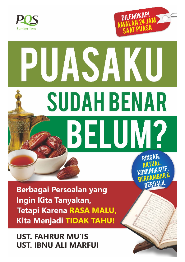 KATA PENGANTAR Tiada kata yang lebih patut kita ucapkan terlebih dahulu selain ucapan syukur puja dan puji hanya kepada Allah penguasa jagat semesta yang telah menganugerahkan kepada kita umat manusia berbagai macam kenikmatan yang tiada terhingga Shalawat dan salam semoga tetap dicurahkan kepada panutan kita Nabi Muhammad Saw beserta keluarganya sahabat sahabatnya serta kita sekalian orang orang yang beriman kepadanya sampai akhir zaman Bahagia sekali rasanya kita dapat menerbitkan buku Puasaku Sudah Benar Belum yang ditulis oleh Ustadz Fahrur Muis dan Ustadz Ibnu Ali Marfui Buku ini merupakan seri lanjutan dari buku sebelumnya yang berjudul Shalatku Sudah Benar Belum yang juga ditulis oleh beliau Entah sudah berapa kali kita puasa namun masih saja ada segudang tanya yang terkadang malu untuk kita tanyakan Banyak pertanyaan yang hinggap kemudian lenyap begitu saja tanpa ada pemecahannya Hal ini bisa jadi karena kebanyakan orang menganggapnya sebagai pertanyaan sepele sehingga malu untuk menanyakannya kepada ustadz atau ahlinya Buku ini merangkum pertanyaan pertanyaan ringan itu dan kami konsultasikan kepada ahlinya penulis Tanya jawab yang ada dalam buku ini merupakan hal yang sangat penting bagi setiap Muslim karena permasalahan yang dibahas sangat sering terjadi dalam pelaksanaan ibadah puasa Apalagi puasa merupakan ibadah wajib maka sudah semestinya kita mengetahui dan mempelajarinya dengan baik dan benar agar tidak terjadi kesalahan 3