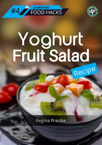 Sinopsis: Buku ini memberikan rekomendasi masakan sederhana yang cocok untuk dijadikan alternatif kegiatan saat berada di rumah, terutama dalam kondisi pandemi seperti saat ini. Salah satu resep yang disajikan adalah *Yoghurt Fruit Salad*, yang merupakan variasi salad buah yang segar dan lezat. Salad ini dibuat dengan memadukan buah-buahan segar seperti pisang, anggur, pepaya, pir, buah naga, serta tambahan buah lainnya sesuai selera, dipadukan dengan yogurt, madu, vanili, dan perasan jeruk lemon. Resep ini menawarkan rasa yang segar, manis, dan cenderung asam, cocok untuk dinikmati saat bersantai. Buku ini juga menggambarkan pentingnya memanfaatkan waktu di rumah dengan cara yang bermanfaat dan kreatif, terutama dalam situasi krisis kesehatan seperti pandemi.