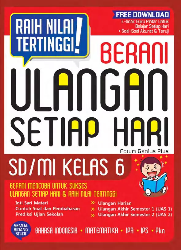 Sinopsis Buku: Buku ini merupakan karya edukatif yang ditujukan untuk siswa SD/MI kelas 6. Buku ini terdiri dari berbagai bab yang membahas materi pelajaran Bahasa Indonesia, Ilmu Pengetahuan Sosial (IPS), dan Ilmu Pengetahuan Alam (IPA), yang disusun secara terstruktur dan mudah dipahami. Bab-bab dalam buku ini mencakup topik-topik penting seperti hiburan, pendidikan, lingkungan, pertanian, pariwisata, konduktor dan isolator panas, perubahan pada benda, gaya dan gerak, energi listrik, serta tata surya. Selain itu, buku ini juga dilengkapi dengan soal-soal ulangan akhir semester dan prediksi ujian sekolah untuk membantu siswa dalam mempersiapkan penilaian akhir tahun. Buku ini dirancang untuk memandu siswa dalam memahami konsep-konsep ilmu pengetahuan secara mendalam, sekaligus meningkatkan kemampuan berpikir kritis dan kreatif. Selain itu, buku ini juga menyertakan informasi mengenai hak cipta dan pentingnya menghargai karya orang lain, sebagai bentuk kesadaran hukum dan etika dalam penggunaan informasi. Dengan materi yang lengkap, disusun secara sistematis, dan dilengkapi latihan soal, buku ini menjadi sumber belajar yang efektif untuk membantu siswa meraih nilai tertinggi dalam pelajaran.