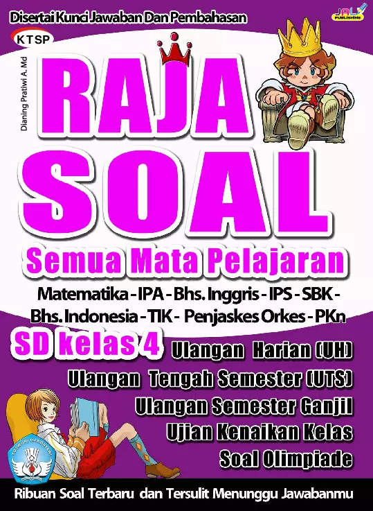 Sinopsis Buku Raja Soal Semua Mata Pelajaran SD Kelas 4 Buku ini merupakan kumpulan soal-soal terbaru dan terpilih dari berbagai mata pelajaran yang ditempuh siswa kelas 4 SD. Buku ini dirancang sebagai sarana latihan yang efektif untuk membantu siswa dalam mempersiapkan diri menghadapi ujian atau ulangan akhir semester. Soal-soal dalam buku ini mencakup berbagai tingkat kesulitan, sehingga dapat melatih kemampuan siswa dalam berbagai aspek belajar. Selain itu, buku ini juga dilengkapi dengan kunci jawaban untuk memudahkan siswa dalam memeriksa dan memahami penyelesaian soal. Buku ini juga menyediakan ringkasan materi yang mendukung penguasaan siswa terhadap konsep-konsep penting dalam setiap pelajaran. Dengan ribuan soal yang menantikan jawabanmu, buku ini menjadi panduan yang sangat berguna bagi siswa yang ingin meningkatkan kemampuan akademiknya dan berkompetisi dalam ajang-ajang akademik yang bergengsi.