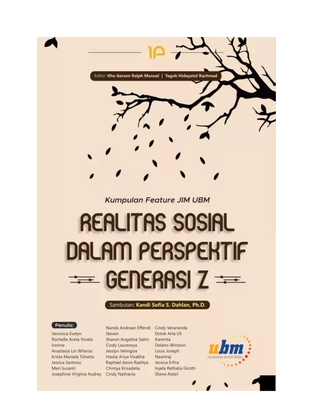 Sinopsis Buku: Buku ini merupakan kumpulan artikel atau *feature* yang ditulis oleh para mahasiswa Universitas Bunda Mulia (UBM) dalam rangka kegiatan Jurnalistik Mahasiswa (JIM) UBM. Buku ini menggambarkan realitas sosial yang dihadapi generasi Z, dengan perspektif yang kritis, kreatif, dan relevan dengan konteks zaman saat ini. Setiap tulisan dalam kumpulan ini tidak hanya menyajikan fakta, tetapi juga menggali makna, tantangan, dan peluang yang dihadapi oleh masyarakat, terutama dalam konteks perkembangan teknologi, media sosial, dan perubahan nilai-nilai sosial. Buku ini juga menjadi bukti bahwa masih ada generasi muda yang berminat untuk menulis, membaca, dan berpartisipasi aktif dalam membangun narasi sosial yang lebih baik. Dengan gaya penulisan yang santai namun mendalam, buku ini mendorong pembaca untuk terus menulis, terus membaca, dan terus berpikir kritis. Dengan demikian, buku ini tidak hanya menjadi koleksi pengetahuan, tetapi juga menjadi inspirasi bagi siapa pun yang ingin berkontribusi dalam membangun dunia melalui tulisan. Escribir para siempre—menulislah terus.