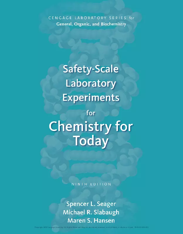 Succeed in your chemistry course using this lab manual s unique blend of laboratory skills and exercises that effectively illustrate concepts from the main text CHEMISTRY FOR TODAY GENERAL ORGANIC AND BIOCHEMISTRY 8th and 9th Editions The book s 15 general chemistry and 20 organic biochemistry safety scale laboratory experiments use small quantities of chemicals and emphasize safety and proper disposal of materials Safety scale is the authors own term for describing the amount of chemicals each lab experiment requires less than macroscale quantities which are expensive and hazardous and more than microscale quantities which are difficult to work with and require special equipment