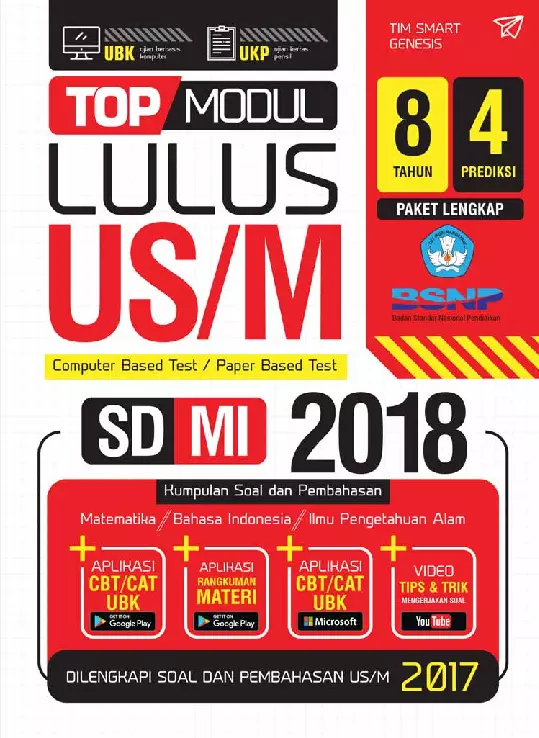 Sinopsis Buku: Buku ini merupakan kumpulan soal-soal dan pembahasan Ujian Sekolah/Madrasah (US/M) yang dirancang untuk membantu siswa dalam mempersiapkan diri menghadapi ujian. Buku ini mencakup berbagai bidang pelajaran, yaitu Bahasa Indonesia, Matematika, dan Ilmu Pengetahuan Alam (IPA). Setiap bab dilengkapi dengan kisi-kisi ujian terbaru, sehingga siswa dapat memahami struktur dan bentuk soal yang akan dihadapi. Dalam bagian Bahasa Indonesia, siswa akan mempelajari indikator-indikator seperti membaca nonsastra, menentukan kalimat utama, ide pokok, simpulan, serta menulis terbatas dengan melengkapi teks percakapan, petunjuk penggunaan sesuatu, dan kalimat-kalimat cara membuat sesuatu. Di bagian Matematika, soal-soal yang disajikan dirancang untuk menguji pemahaman konsep dan kemampuan penerapan dalam berbagai situasi. Sementara itu, pada bagian Ilmu Pengetahuan Alam, soal-soal berfokus pada pemahaman konsep sains, serta kemampuan analisis dan penalaran. Selain itu, buku ini juga menyediakan prediksi soal US/M untuk tahun 2018, serta pembahasan soal ujian tahun sebelumnya, yaitu tahun 2014 hingga 2017. Dengan materi yang disusun secara terstruktur dan komprehensif, buku ini menjadi panduan yang sangat berguna bagi siswa dalam mempersiapkan diri secara efektif dan efisien untuk ujian sekolah/madrasah.
