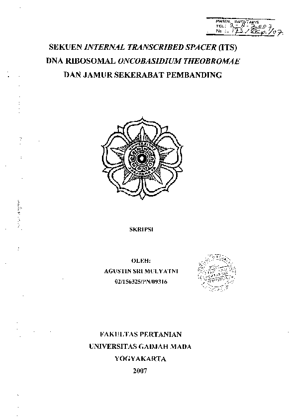 Abstract INTERNAL TRANSCRIBED SPACER ITS SEQUENCES OF RIBOSOMAL DNA ONCOBASIDIUM THEOBROMAE AND OTHER RELATED FUNGI AS COMPARISON AGUSTIN SRI MULYATNI 02 156325 PN 09316 The purposes of this research was to sequence ITS region from ribosomal DNA of Oncobasidium theobromae and compare its sequences to the isolates from Vietnam and Malaysia and also to identify the other related fungi species based on the homology of ITS region Oncobasidium theobromae was isolated from three cocoa plantations in Indonesia that were Jember Kendari and Makassar DNA was isolated from the fungal mycelia and then amplified using ITS 4 and ITS 5 primers resulted in DNA fragments of 600 bp and 700 bp for the isolate of Jember 600 bp for the isolate of Kendari and 700 bp for the isolate of Makassar All the fragments were successfully sequenced except for 600 bp fragment of the isolate of Jember The homology analysis utilized BLAST prooved that ITS sequences Oncobasidium theobromae from Jember was homolog with Rhizoctonia sp whereas isolate of Kendari was homolog with Botryosphaeria sp and isolate of Makassar was homolog with Mycorrhizal basidiomycetes The sequences were then compared to the sequences of Oncobasidium theobromae from Vietnam and Malaysia Phylogenetic analyses using Clustal W program indicate that Oncobasidium theobrome from Indonesia which is represented by isolates from Jember show higher degree of similarity to isolates from Vietnam On the contrary isolates from Indonesia show lower degree of similarity to isolates from Malaysia Key words homology analysis ITS Oncobasidium theobromae rDNA VSD