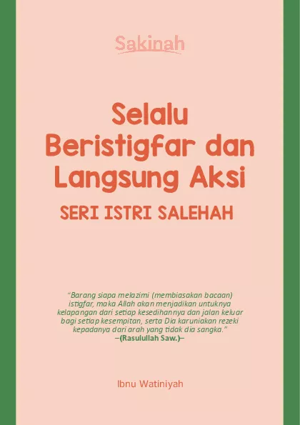 Buku ini mendeskripsikan salah satu sifat istri salehah yang suka beristigfar atau memohon ampun kepada Allah Mereka yang selalu beristigfar memiliki keutamaan mengakui bahwa dirinya tidak pernah bersih dari dosa Bahkan Rasulullah saw yang maksum itu melakukan istigfar puluhan kali setiap hari Istri yang suka beristigfar akan menyadari kesalah kesalahannya baik kekeliruan terhadap syariat maupun terhadap manusia Begitulah istri salehah yang berbakti kepada suami dan mengutamakan keluarganya Buku ini berisi gambaran singkat tentang sifat sifat istri salehah