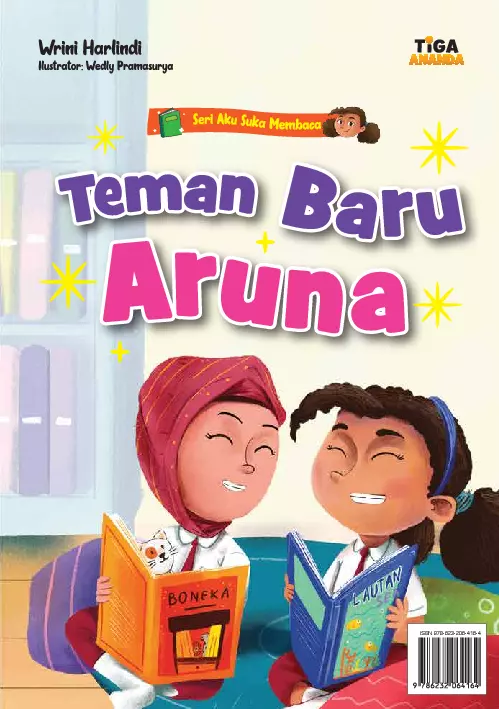 Sinopsis: Buku ini adalah bagian dari Seri *Aku Suka Membaca*, yang ditujukan untuk anak-anak yang baru belajar membaca. Cerita ini mengikuti petualangan Aruna, seorang anak yang sangat menyukai membaca. Aruna sering ditemukan di perpustakaan sekolah, sibuk memilih buku dan bercerita sendiri. Suatu hari, Aruna menemukan sebuah buku yang menarik perhatiannya, dan di dalamnya ia bertemu dengan teman-teman baru yang juga memiliki hobi yang sama, yaitu membaca. Dalam perjalanan mereka, Aruna dan teman-teman menghadiri pembukaan perpustakaan kota. Mereka bersemangat mengikuti acara yang penuh dengan kejutan, seperti panggung boneka dan berbagai buku menarik. Cerita ini tidak hanya menyenangkan, tetapi juga mengandung nilai-nilai literasi, pembentukan karakter, dan membangun hubungan antara anak dan pembaca (harapannya orang tua). Buku ini dirancang agar anak-anak dan orang tua dapat bergantian membaca, dengan bagian teks pendek untuk anak-anak dan teks panjang untuk orang tua. Selain itu, buku ini juga memiliki karakter tersembunyi di setiap halaman untuk memperkaya pengalaman membaca anak-anak.