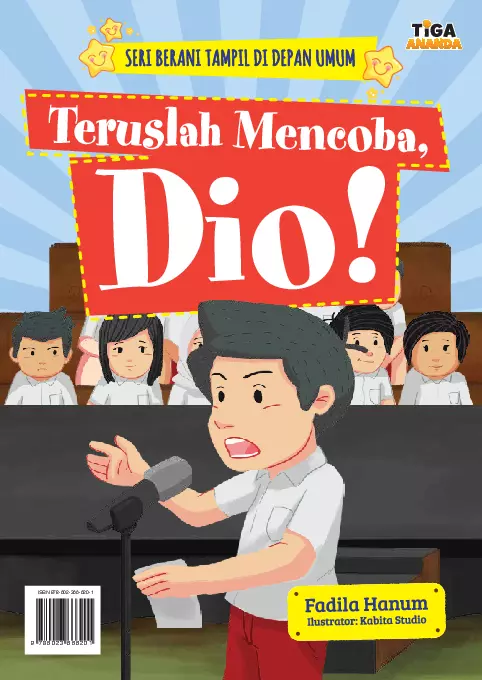 Sinopsis: Dio Amanta Putra adalah seorang siswa yang awalnya merasa malu untuk tampil di depan umum. Ia hanya berpura-pura pidato di depan cermin atau di depan adiknya. Namun, dengan dorongan dari Ibu, Dio berani mencoba dan memutuskan untuk mengikuti lomba pidato di sekolah. Meski awalnya merasa cemas dan gemetar, Dio berlatih dengan tekun setiap hari hingga hari perlombaan tiba. Meskipun tidak meraih juara pertama, Dio berhasil meraih juara harapan kedua dan merasa bangga karena telah mencoba yang terbaik. Setelah lomba, Dio tetap semangat untuk belajar cara bersikap tenang di depan umum, menguasai materi, dan berkomunikasi dengan penonton. Dengan bimbingan Tante Pita, Dio semakin percaya diri untuk terus berlatih dan tampil. Saat Pak Bayu menawarkan kesempatan untuk mewakili sekolah dalam lomba pidato tingkat kecamatan, Dio berani menerima tantangan tersebut, meski sedikit gugup. Buku ini menggambarkan perjalanan Dio dalam mengatasi rasa malu, belajar percaya diri, dan berani tampil di depan umum.