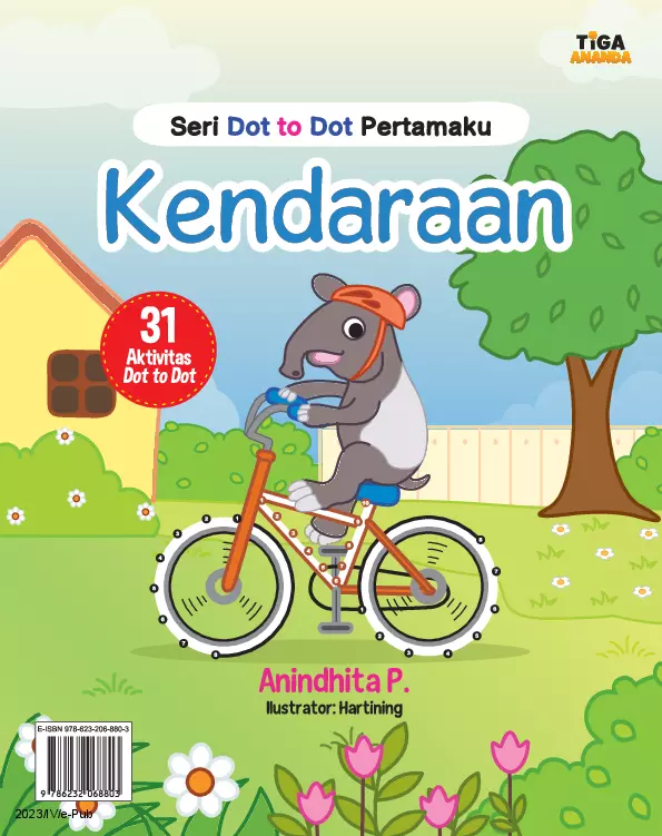 Buku aktivitas dot to dot menebalkan huruf dan menambah warna bertema kendaraan Pengguna dapat memainkannya langsung dengan fitur yang tersedia