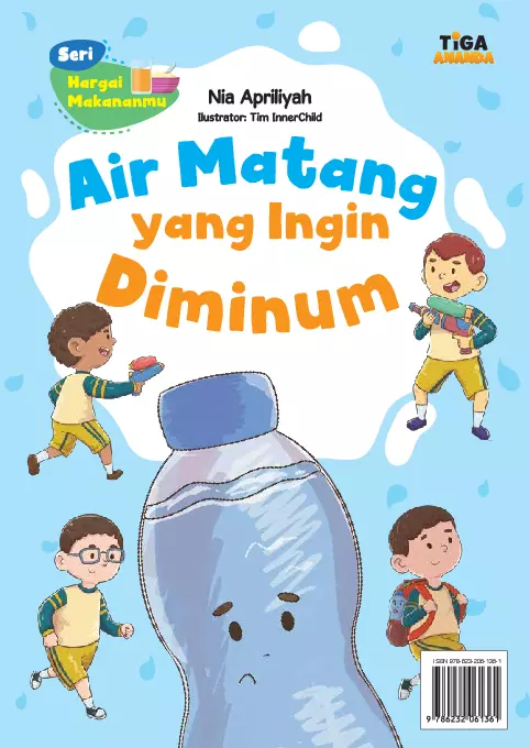 Sinopsis: Di sebuah pagi yang cerah, sebuah keluarga sedang menikmati sarapan, dan dalam keceriaan itu, Air Minum yang ada di dalam teko tersenyum melihat kebahagiaan keluarga tersebut. Namun, kebahagiaan itu tidak bertahan lama. Raka, salah satu anggota keluarga, tidak terlalu memperhatikan Air Minum, malah menggunakan air tersebut untuk bermain pistol air bersama temannya, Alvin. Setelah berolahraga, Raka kehausan, tetapi ia terkejut karena air dalam botolnya sudah habis tanpa sempat diminum. Raka merasa menyesal dan Alvin menawarkan botol airnya. Setelah minum, Raka merasa segar kembali. Dalam cerita ini, Air Minum menggambarkan kebahagiaannya ketika diminum, dan juga menyampaikan pentingnya memanfaatkan air secara bijak. Raka akhirnya berjanji tidak akan membuang air matang yang bermanfaat lagi. Buku ini menyampaikan pesan penting tentang pentingnya menghargai air minum, sekaligus menggambarkan peran air dalam kehidupan sehari-hari. Dengan bahasa yang sederhana dan cerita yang menarik, buku ini cocok untuk anak-anak dan menjadi pengingat bahwa air adalah sumber kehidupan yang perlu dijaga dan dihargai.