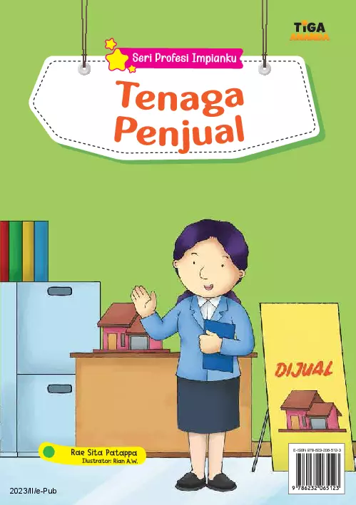 Sinopsis Buku: Buku ini menghadirkan cerita tentang Kak Era, seorang tenaga penjual yang bekerja dalam sebuah perusahaan perumahan. Dengan semangat dan keinginan untuk mempertemukan para pembeli dengan barang atau jasa yang mereka butuhkan, Kak Era menjalani tugasnya dengan penuh tanggung jawab dan kehangatan. Ia memimpin tim tenaga penjual yang memiliki target dalam bekerja, serta menjelaskan berbagai tipe rumah dan fasilitas yang tersedia secara detail kepada calon konsumen. Kak Era aktif dalam berbagai kegiatan seperti membagikan brosur, menjaga stan saat pameran perumahan, dan menjawab pertanyaan calon pembeli dengan ramah. Ia juga menjelaskan sistem kredit dan uang muka secara jelas, sehingga para konsumen seperti Pak Rudi dapat memahami cara pembelian yang sesuai dengan kebutuhan dan kemampuan finansial mereka. Dengan kesabaran dan kejujuran, Kak Era berhasil memandu Pak Rudi menemukan rumah yang ia inginkan, serta menyelesaikan proses jual beli dengan lancar. Buku ini memberikan gambaran nyata mengenai pekerjaan tenaga penjual, tugas-tugasnya, serta cara ia berinteraksi dengan konsumen. Buku ini cocok untuk anak-anak yang ingin mengenal dunia pekerjaan dan membangun semangat untuk mengejar impian mereka.
