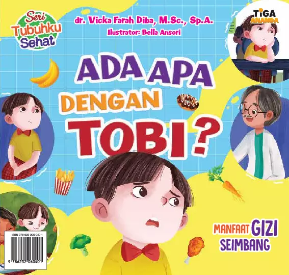 Sinopsis Buku: Buku ini berjudul *Seri Tubuhku Sehat: Ada Apa dengan Tobi?: Manfaat Gizi Seimbang*, yang ditulis oleh dr. Vicka Farah Diba, disunting oleh Dhita Kurniawan, S.Si., dan diterbitkan oleh Tiga Serangkai. Buku ini merupakan karya edukatif yang ditujukan untuk anak-anak Sekolah Dasar, dengan tujuan untuk meningkatkan pemahaman tentang pentingnya pola makan seimbang dan gaya hidup sehat. Dalam buku ini, kisah Tobi menjadi cerita utama yang menggambarkan dampak negatif dari kurangnya konsumsi makanan bergizi. Tobi tampak lesu, tidak bersemangat, dan sering merasa lelah, yang akhirnya membuatnya tertinggal dalam pelajaran. Dengan bantuan Pak Dokter dan guru, Tobi belajar bahwa makanan bergizi adalah kunci untuk menjaga kesehatan tubuh, meningkatkan daya tahan tubuh, dan memperbaiki konsentrasi belajar. Setelah memahami hal ini, Tobi mulai makan makanan sehat dan bergizi, serta menghindari jajanan tidak sehat. Buku ini juga menjelaskan manfaat dari makanan bergizi, seperti membantu pertumbuhan tulang, otot, dan gigi, meningkatkan daya pikir, serta menjaga daya tahan tubuh. Selain itu, buku ini juga memberikan rekomendasi untuk menjaga pola hidup sehat, seperti aktif bergerak, memperhatikan berat badan, dan membatasi konsumsi gula, garam, dan minyak. Buku ini juga mengajarkan pentingnya minum air putih yang cukup, yaitu delapan gelas per hari. Selain itu, buku ini menyertakan daftar pustaka dari berbagai sumber terpercaya, seperti Kementerian Kesehatan RI dan beberapa penelitian terkini, sehingga memperkuat keakuratan informasi yang disampaikan. Buku ini dirancang untuk menjadi sarana edukasi yang menarik dan interaktif, yang dapat memotivasi anak-anak untuk menjaga kesehatan tubuh mereka sejak dini.