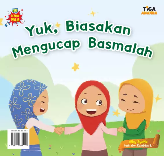 Sinopsis Buku: "Yuk, Biasakan Mengucap Basmalah" Buku ini menceritakan kisah dua sahabat, Najwa dan Salwa, yang duduk bersebelahan di kelas. Mereka bermain dan belajar bersama, termasuk dalam pelajaran kesenian menggambar. Saat mereka sedang asyik menggambar, Najwa mengucapkan basmalah sebagai pembuka, yang kemudian diikuti oleh Salwa. Kisah ini dilanjutkan dengan kejadian ketika Winda, seorang anak perempuan, meminta bantuan Najwa dan Salwa untuk mengambil koin yang jatuh di selokan. Dalam proses itu, Winda penasaran dengan ucapan basmalah yang diucapkan oleh Najwa. Melalui cerita ini, buku ini memberikan pengenalan tentang pentingnya mengucapkan basmalah dalam kehidupan sehari-hari, terutama dalam mengawali tindakan baik dan berbagi. Buku ini ditujukan untuk anak-anak, dengan pesan moral yang disampaikan secara sederhana dan menarik.