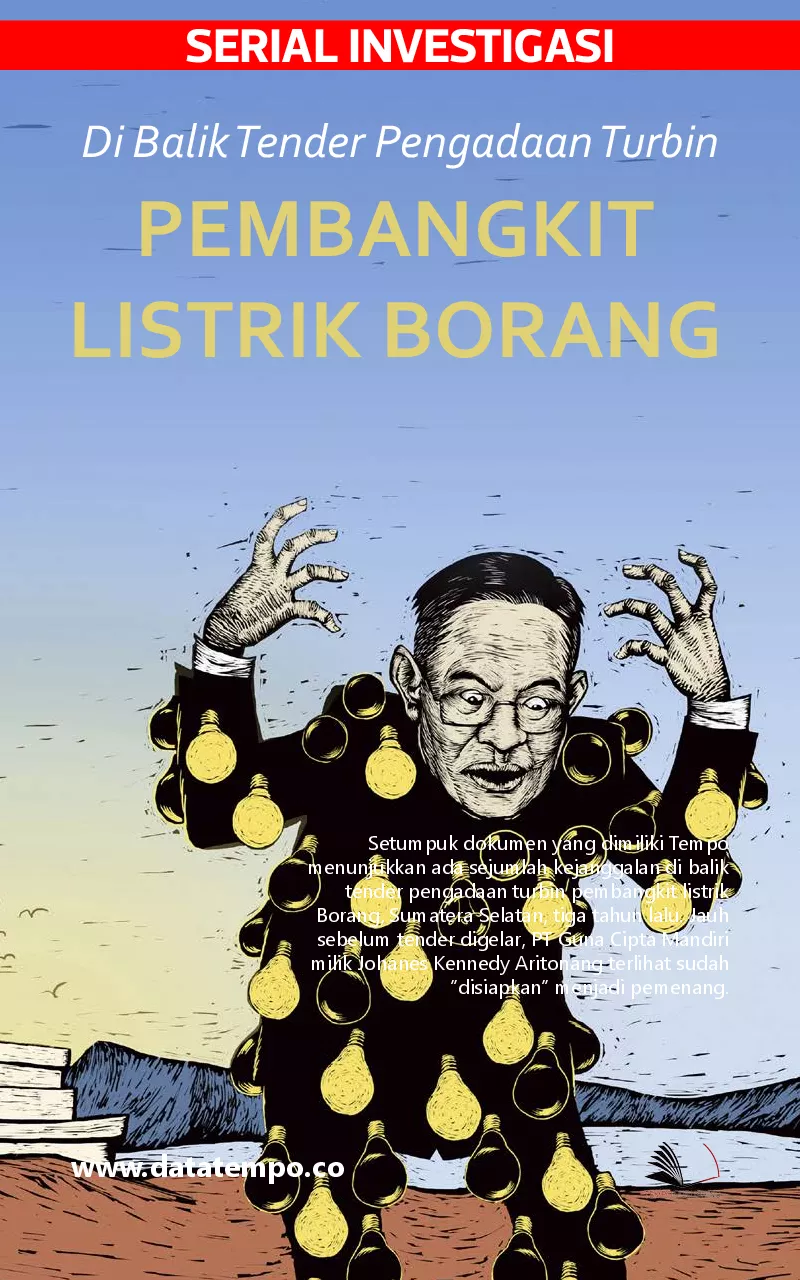 Setumpuk dokumen yang dimiliki Tempo menunjukkan ada sejumlah kejanggalan di balik tender pengadaan turbin pembangkit listrik Borang Sumatera Selatan tiga tahun lalu Jauh sebelum tender digelar PT Guna Cipta Mandiri milik Johanes Kennedy Aritonang terlihat sudah disiapkan menjadi pemenang