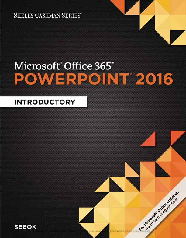 Discover the most important new features that the latest version of Microsoft PowerPoint 2016 has to offer with the focused approach found in MICROSOFT OFFICE 365 POWERPOINT 2016 INTRODUCTORY This new edition is part of the acclaimed Shelly Cashman Series that has effectively introduced computer skills to millions of students like you MICROSOFT OFFICE 365 POWERPOINT 2016 INTRODUCTORY continues the Series strong history of innovation with an enhanced learning approach to address your needs no matter what your learning style A trademark step by step screen by screen approach encourages you to expand your understanding of Microsoft PowerPoint 2016 through experimentation critical thought and personalization This new edition delivers the most effective educational materials specifically designed to engage improve retention and prepare you for success with Microsoft PowerPoint 2016