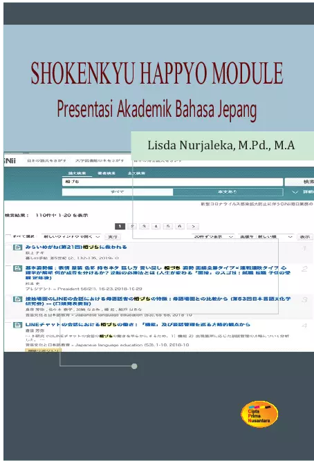 Buku ajar ini memuat tentang materi artikel ilmiah sebagai bahan referensi penelitian dan metode presentasi akademik dalam bahasa Jepang Buku Ajar Shokenkyu Happyo ini juga memuat berbagai contoh dan studi kasus yang nanti akan didiskusikan di dalam k