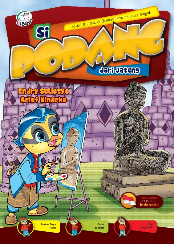 Teman teman sudah mengenal Provinsi Jawa Tengah Ya provinsi yang memiliki kekayaan dan sumber daya alam yang tersebar di 29 kabupaten dan 6 kota Jawa Tengah memiliki berbagai macam tradisi dan sejarah yang perlu kita semua ketahui Apa saja ya yang menarik di Jawa Tengah Sabar Si Podang dengan senang hati akan mengajak kalian menelusuri sejarah mengenal tradisi dan hal hal yang berkaitan dengan Jawa Tengah Si Podang akan menuntun kalian ke tempat tempat bersejarah seperti Keraton Surakarta Lawang Sewu Museum Ronggowarsito tempat tempat wisata alam dan tempat lain yang tak kalah serunya Dengan mengenal berbagai tempat tempat penting tersebut diharapkan kalian semakin mencintai keragaman budaya Indonesia Ayo baca terus buku Si Podang dari Jawa Tengah Dapatkan informasi dan pengetahuan di dalamnya Kalian pasti senang karena buku ini juga dilengkapi cerita legenda permainan juga keterampilan sains yang sayang untuk dilewatkan