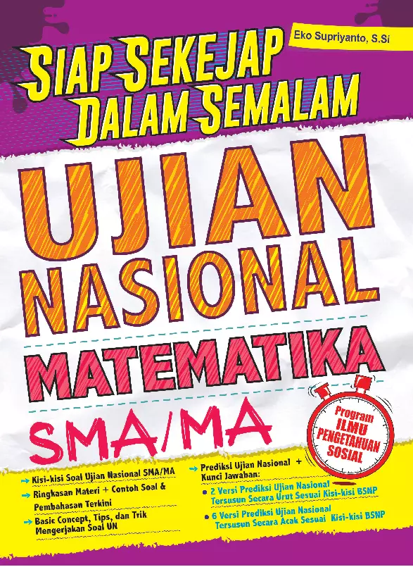 Sinopsis Buku: Buku ini merupakan panduan belajar terstruktur dan komprehensif untuk menghadapi Ujian Nasional (UN) Matematika Program Studi Ilmu Pengetahuan Sosial (IPS) tingkat SMA/MA tahun 2012. Buku ini dirancang untuk membantu siswa mempersiapkan diri secara efektif dan efisien dengan materi yang disusun sesuai dengan kisi-kisi ujian nasional tahun 2011/2012. Buku ini terdiri dari beberapa bab utama yang mencakup kompetensi-kompetensi yang diujikan dalam UN, antara lain: - Logika - Eksponen dan Logaritma - Persamaan dan Fungsi Kuadrat - Matriks - Deret - Limit - Diferensial dan Integral - Peluang Setiap bab disusun secara sistematis dengan penjelasan konsep yang jelas, dilengkapi dengan contoh soal dan pembahasan yang relevan untuk memperkuat pemahaman siswa. Pembahasan soal-soal tersebut dirancang untuk membantu siswa menguasai berbagai jenis soal yang mungkin muncul dalam ujian, baik soal pilihan ganda maupun soal uraian. Selain itu, buku ini juga dilengkapi dengan kata pengantar yang berisi semangat dan motivasi untuk siswa dalam menghadapi ujian nasional. Penulis berharap melalui buku ini, siswa dapat meningkatkan keyakinan diri, memperoleh nilai maksimal, dan memperoleh pelajaran berharga dalam kehidupan sehari-hari. Dengan struktur yang jelas, penjelasan yang mudah dipahami, dan contoh soal yang relevan, buku ini menjadi sumber belajar yang sangat bermanfaat bagi siswa SMA/MA dalam mempersiapkan diri menghadapi ujian nasional.