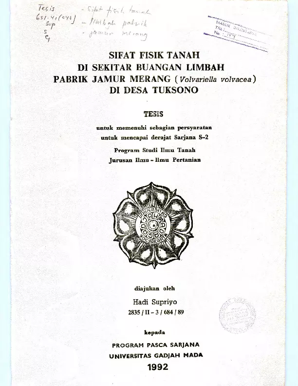 Sifat Fisik Tanah Di Sekitar Buangan Limbah Pabrik Jamur Merang (Volvariella Volvacea) Di Desa Tuksono Hadi Supriyo Fakultas Pertanian UGM Konten Lokal Konten Lokal 31100