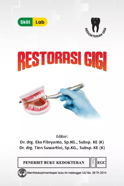 Mahasiswa kedokteran gigi adalah calon dokter gigi yang akan memberikan pelayanan kesehatan gigi Satu di antara kompetensi dasar yang harus dicapai adalah mampu melakukan tindakan restorasi gigi Mahasiswa harus mampu melakukan restorasi pada kavitas yang terbentuk di berbagai permukaan gigi baik di gigi anterior maupun posterior Mahasiswa harus mampu melakukan preparasi kavitas kelas I II III IV dan V klasifikasi G V Black serta mampu melakukan restorasi kavitas dengan bahan resin komposit dan GIC dalam Skill Lab ini Mahasiswa juga harus mampu melakukan preparasi gigi untuk restorasi indirek onlay metal