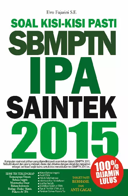 Sinopsis Buku: Buku ini merupakan panduan lengkap dan terpercaya untuk mempersiapkan diri menghadapi Seleksi Bersama Masuk Perguruan Tinggi Negeri (SBMPTN) 2015. Buku ini dirancang khusus bagi para calon mahasiswa yang ingin memasuki PTN, terutama bagi yang tidak dapat mengikuti jalur SNMPTN. Dengan mengandung prediksi soal berdasarkan kisi-kisi SBMPTN 2015, buku ini menjadi jaminan kelulusan bagi para peserta ujian. Buku ini terdiri dari berbagai paket soal yang mencakup mata pelajaran IPA (SAINTEK), yaitu Matematika Dasar, Biologi, Fisika, dan Kimia. Setiap paket soal dilengkapi dengan kunci jawaban untuk memudahkan pembelajaran dan evaluasi diri. Selain itu, buku ini juga menyediakan informasi terkait prosedur pendaftaran SBMPTN, termasuk panduan bagi pelamar program Bidikmisi, serta detail tentang pengisian data, pembayaran, dan penggunaan KAP dan PIN SBMPTN. Dengan mempelajari materi dan soal-soal dalam buku ini, diharapkan para calon peserta SBMPTN dapat meningkatkan kepercayaan diri, memperkuat pemahaman konsep, dan siap menghadapi ujian dengan optimis. Buku ini menjadi panduan wajib bagi siapa pun yang ingin lolos dalam SBMPTN 2015.