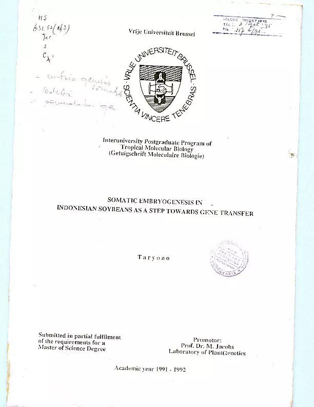 Somatic Embryogenesis In Indonesia Soybeans A Step Towards Gene Transfer Taryono Fakultas Pertanian UGM Konten Lokal Konten Lokal 31101