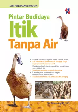 Buku ini menawarkan metode budidaya itik tanpa perlu diangon secara intensif Prinsipnya itik dibesarkan dalam kandang tanpa perlu digembalakan yang menguras banyak tenaga Hasilnya cukup bagus produktivitas telur meningkat itik petelur dan waktu yang dibutuhkan untuk panen lebih singkat untuk itik pedaging Bagaimana kita selengkapnya agar budidaya itik lebih maksimal buku ini jawabannya