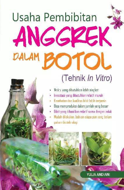 Bisnis tanaman hias khususnya anggrek sangat berperan dalam rangka peningkatan ekonomi masyarakat Sektor ini bisa saja berperan lebih besar lagi Sebab keanekaragaman anggrek di Indonesia yang mencapai ribuan adalah potensi besar untuk membentuk industri yang kokoh Salah satu alternatif untuk memperbanyak tanaman anggrek dengan melalui kultur jaringan Bila dikembangkan secara cermat usaha ini mendatangkan keuntungan fnansial yang lumayan besar Kultur jaringan sebenarnya dapat dilakukan oleh siapa saja Yang kita butuhkan hanya panduan praktis Buku ini mencoba menjawab hal tersebut Buku ini mengupas seluk beluk teknik pembibitan anggrek melalui kultur jaringan teknik in vitro skala rumah tangga yang siap diaplikasikan di rumah Anda masing masing