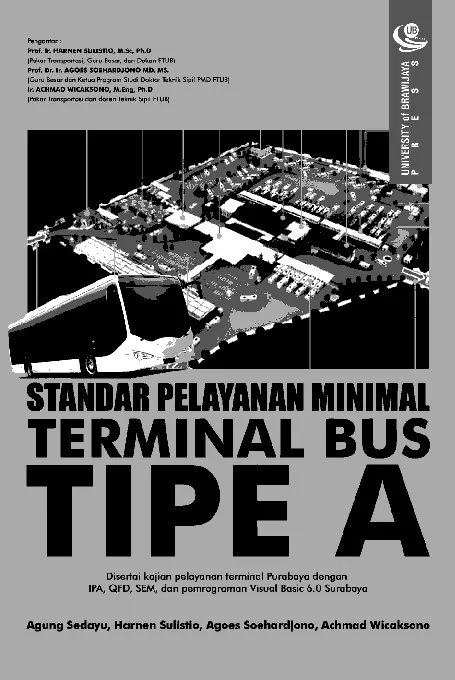 Sinopsis Buku Buku ini membahas tentang standar pelayanan minimal (SPM) terminal bus yang dirancang untuk meningkatkan kualitas pelayanan dalam sistem transportasi umum di Indonesia. Penulis menjelaskan pentingnya memperhatikan kebutuhan pelanggan, seperti penumpang, dalam perencanaan dan pengembangan terminal. Buku ini juga mengupas peran terminal sebagai fasilitas publik yang harus memberikan kenyamanan dan kemudahan akses bagi pengguna. Dalam rangka memperbaiki kondisi terminal, buku ini memberikan referensi dan acuan terkait kualitas pelayanan, serta menawarkan analisis kinerja terminal sebagai dasar pengembangan infrastruktur transportasi yang lebih baik. Buku ini sangat relevan bagi akademisi, peneliti, dan pihak terkait dalam upaya meningkatkan layanan transportasi di Indonesia.