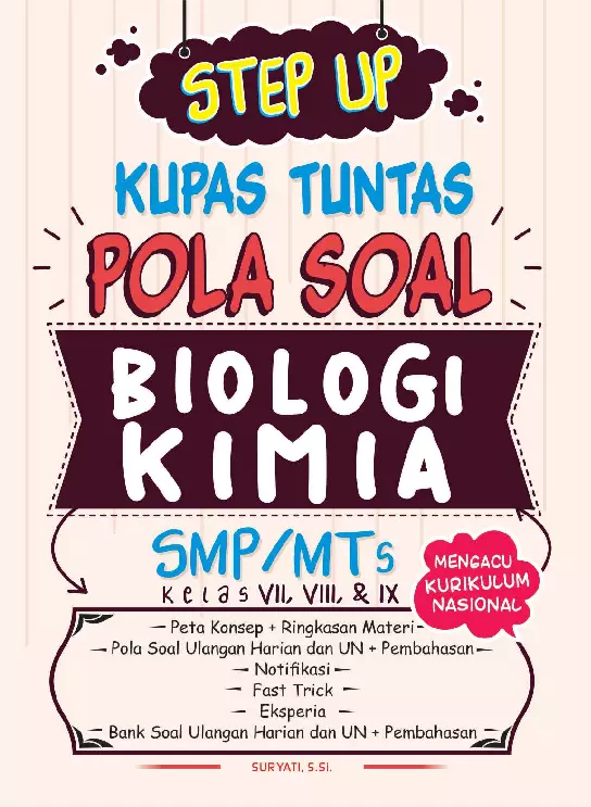 Sinopsis Singkat Buku "Step Up Kupas Tuntas Pola Soal Biologi-Kimia SMP Kelas VII, VIII, & IX" Buku ini merupakan panduan komprehensif yang dirancang untuk membantu siswa SMP kelas VII, VIII, dan IX dalam memahami dan menguasai materi Biologi dan Kimia. Buku ini dilengkapi dengan berbagai pola soal yang disusun secara sistematis, mulai dari soal ulangan harian, soal Ujian Nasional (UN), hingga soal olimpiade. Setiap jenis soal disusun dengan tingkat kesulitan yang beragam, sehingga memungkinkan siswa untuk menguji dan meningkatkan kemampuan pemecahan masalah serta pemahaman konsep. Selain soal-soal yang berpola, buku ini juga dilengkapi dengan bagian "Eksperia", yang merupakan rangkaian kegiatan ilmiah yang bertujuan untuk meningkatkan keterlibatan siswa secara motorik dan membiasakan mereka dalam memecahkan masalah secara runut berdasarkan alur metode ilmiah. Hal ini membantu siswa dalam mengembangkan pola pikir ilmiah dan kemandirian dalam belajar. Buku ini juga dilengkapi dengan "POLAPEDIA", yang merupakan bagian khusus yang menjelaskan konsep-konsep penting dalam Biologi dan Kimia secara ringkas dan jelas. Bagian ini sangat berguna sebagai referensi tambahan untuk memperkuat pemahaman siswa terhadap materi yang dipelajari. Dalam buku ini juga terdapat "STEP UP SOAL CAMPURAN" dan "STEP UP SOAL TANTANGAN", yang bertujuan untuk melatih siswa dalam mengerjakan soal-soal yang lebih kompleks dan membutuhkan pemahaman yang lebih mendalam. Dengan adanya berbagai jenis soal dan latihan yang beragam, buku ini menjadi alat yang efektif untuk membantu siswa mencapai target akademik yang lebih baik. Dengan struktur yang jelas dan materi yang terorganisir, buku ini adalah panduan yang sangat bermanfaat bagi siswa SMP yang ingin meningkatkan kemampuan akademik dalam bidang Biologi dan Kimia.