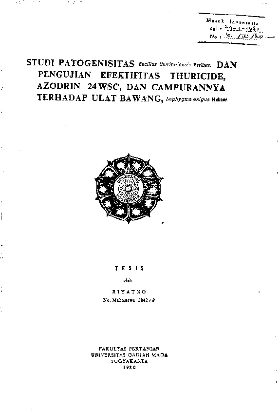 Studi Patogenisitas Bacillus Thuringiensis Berliner. Dan Pengujian Efektifitas Thuricide, Azodrin 24Wsc, Dan Campurannya Terhadap Ulat Bawang, Laphygma Exigua Hubner Riyanto Fakultas Pertanian UGM Konten Lokal Konten Lokal 30977