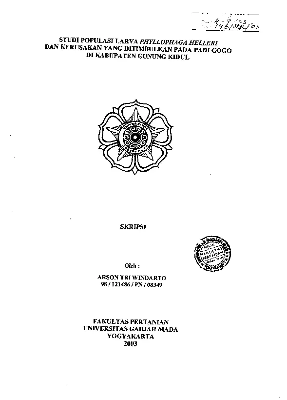 Studi Populasi Larva Phyllophaga Helleri Dan Kerusakan Yang Ditimbulkan Pada Padi Gogo Di Kabupaten Gunung Kidul Arson Tri Windarto Fakultas Pertanian UGM Konten Lokal Konten Lokal 48304