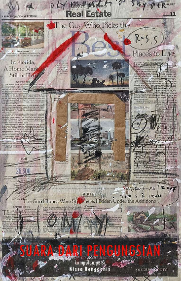 Di saat doa doa diterbangkan Mimpi mimpi dilayarkan Kami hidup berimpitan Di antara puisi dan slogan slogan Suara dari Pengungsian