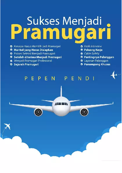 Sinopsis Buku: Buku *Sukses Menjadi Pramugari* ini merupakan panduan lengkap dan mendalam bagi siapa pun yang memiliki mimpi menjadi seorang pramugari. Buku ini tidak hanya menguraikan tugas dan tanggung jawab seorang pramugari selama penerbangan, tetapi juga menjelaskan secara rinci proses rekrutmen, pendidikan, serta persiapan yang diperlukan untuk memenuhi syarat menjadi pramugari yang profesional. Dalam buku ini, pembaca akan menemukan informasi tentang bagaimana seorang pramugari menjaga kenyamanan dan keselamatan penumpang selama penerbangan, mulai dari saat boarding hingga setelah pesawat mendarat. Selain itu, buku ini juga membahas pentingnya kemampuan berbahasa asing, khususnya bahasa Inggris, serta pengetahuan umum yang diperlukan untuk menjalani profesi ini. Buku ini juga memperkenalkan konsep *walk interview* yang sering digunakan dalam proses seleksi calon pramugari, serta memberikan wawasan tentang peluang kerja setelah menyelesaikan pendidikan di sekolah penerbangan. Selain itu, buku ini menyajikan informasi tentang pentingnya memiliki passion dan semangat tinggi dalam membangun karier sebagai pramugari. Bagi para remaja atau mahasiswa yang bercita-cita menjadi pramugari, buku ini menjadi sumber informasi yang relevan dan berharga untuk mempersiapkan diri secara komprehensif dan profesional.