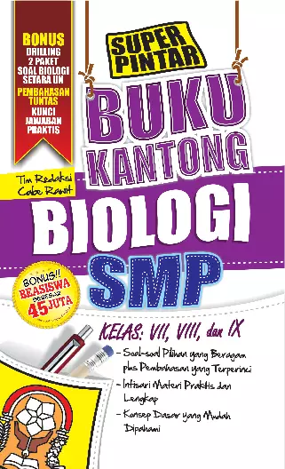 Buku Kantong BIOLOGI SMP Kelas VII, VIII, dan IX ini dirancang untuk menjadi panduan belajar yang praktis dan mudah dipahami bagi siswa SMP. Buku ini menyajikan materi biologi secara sistematis, terstruktur, dan sesuai dengan kurikulum pendidikan nasional. Isi buku mencakup konsep dasar biologi seperti struktur dan fungsi makhluk hidup, sistem tubuh manusia, ekosistem, serta peran manusia dalam menjaga keseimbangan lingkungan hidup. Penjelasan disajikan secara jelas dan disertai dengan ilustrasi yang menarik untuk memudahkan pemahaman. Buku ini juga dilengkapi dengan latihan soal yang beragam untuk menguji pemahaman siswa. Buku ini cocok sebagai acuan belajar mandiri maupun sebagai bahan pendukung dalam pembelajaran di kelas.