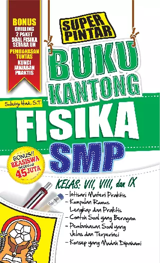 Sinopsis Buku Kantong Fisika SMP Kelas VII, VIII, dan IX Buku ini merupakan panduan komprehensif dalam mempelajari konsep-konsep dasar fisika yang relevan dengan kurikulum Sekolah Menengah Pertama (SMP). Buku ini dirancang untuk membantu siswa memahami prinsip-prinsip fisika secara sistematis, mulai dari konsep-konsep dasar hingga penerapan dalam kehidupan sehari-hari. Buku ini mencakup materi yang terbagi dalam tiga tingkat kelas, yaitu Kelas VII, VIII, dan IX. Materi yang disajikan mencakup berbagai topik penting dalam fisika, seperti zat dan kalor, gerak, gaya, usaha, energi, tekanan, getaran, gelombang, bunyi, dan optik. Setiap bab dilengkapi dengan penjelasan yang jelas, contoh soal, dan latihan untuk memperkuat pemahaman siswa. Selain itu, buku ini juga menekankan pentingnya penerapan ilmu fisika dalam kehidupan sehari-hari, sehingga siswa tidak hanya memahami teori, tetapi juga mampu menghubungkannya dengan fenomena nyata di sekitar mereka. Buku ini juga dilengkapi dengan ilustrasi dan diagram yang memudahkan pemahaman konsep-konsep abstrak dalam fisika. Buku Kantong Fisika SMP ini dirancang untuk menjadi sumber belajar yang praktis, mudah dipahami, dan relevan dengan kebutuhan pembelajaran siswa di tingkat SMP. Dengan pendekatan yang jelas dan terstruktur, buku ini berharap dapat menjadi teman belajar yang membantu siswa menguasai ilmu fisika secara menyeluruh.