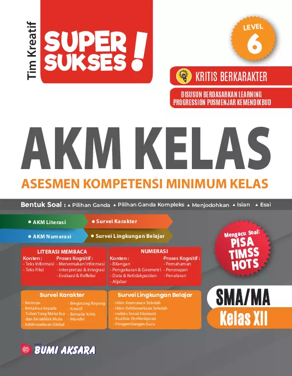 Buku soal Super Sukses AKM Kelas ini disiapkan untuk melatih dan meningkatkan kemampuan literasi siswa terutama Literasi Membaca dan Numerasi yang diharapkan meningkat pada setiap levelnya Adapun adanya contoh soal Survei Karakter untuk melatih siswa bagaimana dapat mendekati atau mencapai profil Pelajar Pancasila Survei Lingkungan Karakter untuk melihat kenyamanan dan kebutuhan siswa terhadap lingkungan sekolahnya Mengapa buku ini harus dimiliki siswa Disusun berdasarkan Learning Progression Pusmenjar Kemendikbud Semua komponen AKM diintegrasikan ke dalam setiap teks stimulus soal Mata pelajaran terintegrasi ke dalam teks stimulus soal Setiap teks memuat soal dengan proses kognitif secara berurutan Soal soal mengacu pada soal PISA TIMSS dan soal HOTS Bentuk soal bervariasi mulai dari pilihan ganda pilihan ganda kompleks menjodohkan isian dan esai Memuat contoh Survei Karakter yang sesuai dengan karakter Pelajar Pancasila dan Survei Lingkungan Belajar Buku ini melatih siswa untuk memahami literasi membaca dan numerasi dengan teks teks atau stimulus yang aplikatif Dengan belajar menggunakan buku Super Sukses AKM Kelas ini akan meningkatkan pemahaman siswa terhadap literasi membaca dan numerasi sejalan juga dengan meningkatnya kemampuan analisis siswa
