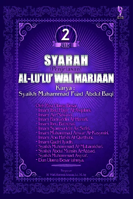 Kitab Al Lu lu Wa Al Marjaan Jilid 2 adalah kitab yang disusun oleh Syaikh Muhammad Fu ad Abdul Baqi Nama lengkap kitab ini Al Lu lu Wa Al Marjaan Fiimaa Ittafaqa Alaihi Asy Syaikhan Kitab ini mengumpulkan Hadis Hadis shahih yang disepakati dua orang imam yaitu Imam Abu Abdillah Muhammad bin Ismail Al Bukhari dan Imam Muslim bin Hajjaj An Naisaburi Mengenai kedudukan Hadis yang disepakati keshahihannya Imam As Suyuthi dalam Tadrib Ar Rawi berkata Hadis shahih ada bermacam macam Yang paling tinggi tingkatannya adalah yang disepakati oleh Al Bukhari dan Muslim dalam kedua kitab Shahihnya Kemudian yang diriwayatkan oleh Al Bukhari sendirian Dan seterusnya Jadi kedudukan Hadis yang disepakati keshahihannya oleh Imam Al Bukhari dan Muslim merupakan Hadis shahih yang tingkat keshahihannya paling tinggi Karena itu banyak kaum muslimin menjadikannya sebagai rujukan dalam banyak taklim mereka Syarah penjelasan Kitab Al Lu lu Wa Al Marjaan ini didasarkan dan diambil dari kitab syarah Hadis para ulama terkemuka yaitu 1 Fathul Bari Syarah Shahih Al Bukhari karya tulis Imam Al Hafidz Ibnu Hajar Al Asqalani 2 Al Minhaj Syarah Shahih Muslim bin Al Hajjaj karya Imam Muhyiddin An Nawawi 3 Umdatul Qari Syarah Shahih Al Bukhari karya Badruddin Al Aini Al Hanafi 4 Syarah Shahih Al Bukhari karya Ibnu Baththal dengan lama lengkap Abul Hasan Ali bin Khalaf bin Abdil Malik Al Qurthubi 5 Syarah Shahih Al Bukhari Syamsuddin As Safiiri 6 Faidhul Baari Syarah Shahih Al Bukhari karya Muhammad Anwar Syah Al Kasymiri 7 Al Mufhim Limaa Asykala Min Talkhish Kitabi Muslim karya Imam Abu Hafsh Umar bin Ibrahim Al Qurthubi 8 Ikmaal Al Mu lim Syarah Shahih Muslim karya Qadhi Iyadh 9 Tuhfatul Ahwadzi Bisyarhi Jami At Tirmidzi karya Muhammad bin Abdurrahman Al Mubarakfuri 10 Syarah Sunan Abi Dawud karya Syaikh Abdul Muhsin Al Abbad 11 Aunul Ma bud Syarah Sunan Abi Dawud karya Muhammad Asyraf bin Amir bin Ali bin Haidar Al Adhim Abadi Dan syarah syarah lainnya Buku ini insya Allah menjadi referensi yang sangat penting dalam kajian Hadis utamanya yang berbahasa Indonesia Selamat membaca