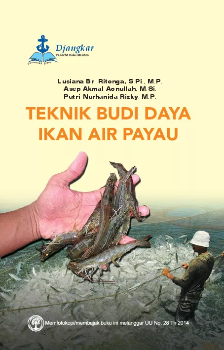 Budi daya air payau adalah budi daya organisme akuatik yang produk akhirnya dihasilkan di lingkungan air payau dengan tahap awal siklus hidup spesies yang dibudidayakan bisa saja di perairan tawar atau laut Buku Teknik Budi Daya Ikan Air Payau merupakan subjek yang penting dipelajari oleh taruna jurusan kelautan dan perikanan untuk memperdalam pengetahuan dan keterampilan mengenai cara membudidayakan ikan air payau Materi yang dibahas dalam buku ini telah disesuaikan dengan kompetensi taruna kelautan dan perikanan yang tertuang dalam Peraturan Menteri Kelautan dan Perikanan Republik Indonesia Nomor 19 PER BRSDM 2019 tentang Kurikulum Politeknik Kelautan dan Perikanan Edisi 2019 Buku ini membahas tentang Ruang lingkup budi daya ikan air payau Sistem budi daya ikan air payau Penentuan lokasi budi daya ikan air payau Desain dan tata letak wadah budi daya Teknik pembesaran ikan bersirip Teknik pembenihan ikan tidak bersirip Teknik pemeliharaan rumput laut di tambak Biosecurity Teknik panen