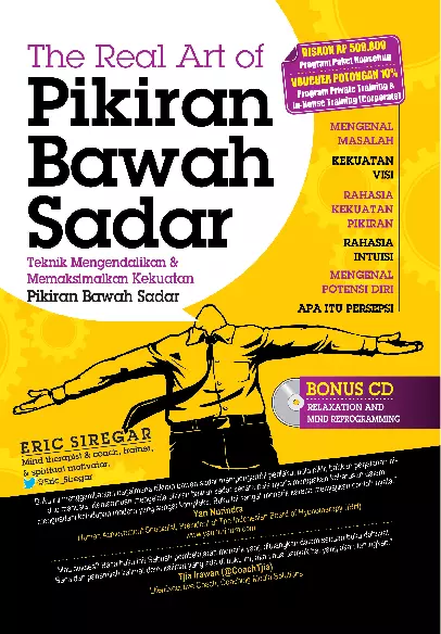 Sinopsis Buku: Buku *The Real Art of Pikiran Bawah Sadar* karya Eric Siregar merupakan panduan praktis dan mudah dipahami untuk menggali potensi diri melalui pemahaman tentang mekanisme pikiran manusia. Buku ini menggabungkan konsep dari tiga disiplin ilmu, yaitu hypnosis, hipnoterapi, dan neuro-linguistic programming (NLP), yang semuanya fokus pada eksplorasi dan pengelolaan pikiran bawah sadar. Penulis menjelaskan bagaimana pikiran bawah sadar memengaruhi perilaku, pola pikir, dan bahkan arah kehidupan seseorang. Buku ini tidak hanya berisi teori, tetapi juga kumpulan cerita nyata dan pengalaman pribadi penulis bersama klien dan teman-temannya. Dengan pendekatan yang ringan dan aplikatif, buku ini menjadi sarana untuk memahami diri sendiri, mengoptimalkan cara berpikir, dan meningkatkan kualitas hidup. Buku ini cocok bagi siapa saja yang ingin memperkaya pemahaman tentang diri dan mengembangkan kemampuan bawah sadar secara alami dan efektif.