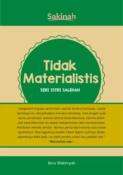 Materi memang penting sebagai bekal dan modal berumah tangga Namun materi tidak selalu bisa membuat rumah tangga kokoh Seorang Muslim boleh kaya Tapi kekayaannya harus digunakan untuk kepentingan akhiratnya Tidak boleh cinta dunia Sebaliknya mereka yang materialistis akan cinta dunia Inilah yang dilarang agama Oleh karena itu istri salehah tidak mencintai materi melebihi kecintaannya kepada syariat agama Hidup sederhana lebih baik daripada kaya tapi digunakan untuk maksiat kepada Tuhan Buku ini berisi gambaran singkat tentang sifat sifat istri salehah