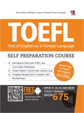 Sinopsis Buku: Buku ini merupakan panduan lengkap dan terstruktur untuk mempersiapkan diri menghadapi ujian TOEFL (Test of English as a Foreign Language). Buku ini dirancang untuk membantu peserta tes meningkatkan kemampuan bahasa Inggris secara menyeluruh, terutama dalam empat aspek utama yang diujikan dalam TOEFL, yaitu listening, structure and written expression, serta reading. Selain itu, buku ini juga mencakup pembahasan mengenai tenses dalam bahasa Inggris, seperti simple present, present continuous, present perfect, present perfect continuous, dan simple past, yang merupakan bagian penting dalam struktur dan ekspresi tertulis. Buku ini disusun dengan metode pembelajaran yang jelas dan praktis, berdasarkan indikator-indikator baku yang digunakan dalam penyusunan soal TOEFL. Penulis membahas berbagai strategi dan skill yang diperlukan untuk masing-masing bagian ujian, sehingga pembaca dapat memahami pola soal, memperkaya pemahaman, dan meningkatkan kemampuan berpikir kritis dalam menghadapi ujian. Dengan materi yang terorganisir dan penjelasan yang mudah dipahami, buku ini menjadi sumber belajar yang ideal untuk calon peserta TOEFL yang ingin mempersiapkan diri secara efektif dan efisien.