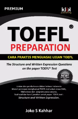 Sinopsis Buku: Buku ini merupakan panduan praktis dan komprehensif untuk mempersiapkan ujian TOEFL® Test, khususnya untuk bagian *Structure* dan *Written Expression*. Buku ini ditujukan bagi siswa SMU, mahasiswa, dan peserta program pasca sarjana yang ingin meningkatkan kemampuan berbahasa Inggris secara struktural dan tatabahasa. Buku ini terdiri dari berbagai topik yang disusun secara terstruktur dan mudah dipahami, mulai dari dasar-dasar struktur kalimat hingga pemahaman tentang penggunaan tenses, passive voice, dan berbagai jenis klausa. Pembahasan disertai dengan contoh soal dan penjelasan yang jelas, sehingga pembaca dapat memahami konsep secara mendalam dan mempraktikkannya dalam ujian TOEFL®. Selain itu, buku ini juga mencakup penjelasan tentang penggunaan connector, parallel structure, serta berbagai kesalahan umum dalam struktur dan ekspresi tertulis. Penulis memberikan panduan yang jelas dan terarah untuk membantu pembaca mengidentifikasi dan memperbaiki kesalahan dalam penulisan dan penggunaan tata bahasa Inggris. Dengan memahami dan mempraktikkan materi yang disajikan dalam buku ini, pembaca dapat meningkatkan kemampuan berbahasa Inggris secara signifikan dan mempersiapkan diri secara efektif untuk menghadapi ujian TOEFL® Test.