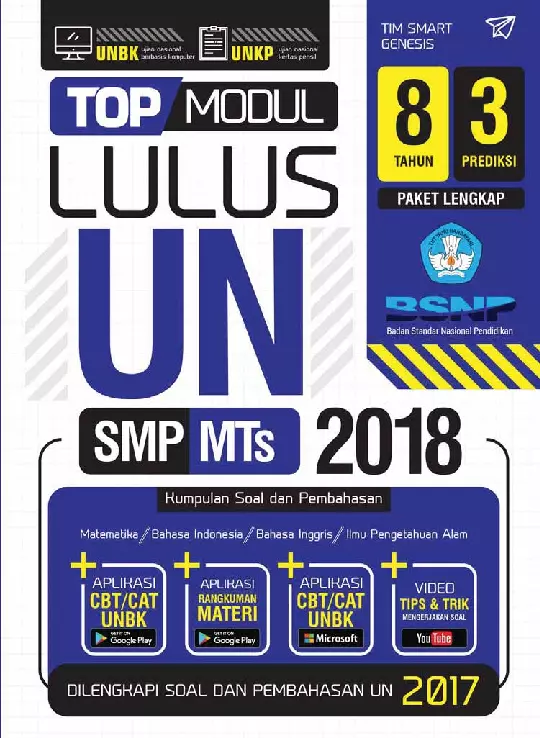 Sinopsis Buku: Buku *Top Modul Bedah Kisi-Kisi UN SMP 2018* merupakan panduan lengkap dan praktis untuk membantu siswa SMP dalam mempersiapkan diri menghadapi Ujian Nasional (UN) tahun 2018. Buku ini dirancang untuk memudahkan siswa dalam memahami dan menguasai materi pelajaran yang diujikan, serta meningkatkan kemampuan menyelesaikan soal-soal UN dengan lebih percaya diri. Buku ini mengandung soal-soal Ujian Nasional dari tahun 2010 hingga 2017, yang telah disusun secara terstruktur dan relevan dengan kisi-kisi UN 2018. Soal-soal tersebut mencakup empat mata pelajaran utama, yaitu Bahasa Indonesia, Bahasa Inggris, Ilmu Pengetahuan Alam (IPA), dan Matematika. Setiap bab dilengkapi dengan kunci jawaban dan pembahasan yang jelas, rinci, dan mudah dipahami, sehingga siswa dapat memahami konsep dan cara menyelesaikan soal secara mendalam. Dengan berlatih secara rutin menggunakan soal-soal dalam buku ini, siswa tidak hanya meningkatkan kemampuan akademiknya, tetapi juga mengurangi kecemasan terhadap Ujian Nasional. Buku ini menjadi sarana efektif untuk mempersiapkan diri secara komprehensif dan meningkatkan peluang lulus dalam pendidikan menengah pertama.