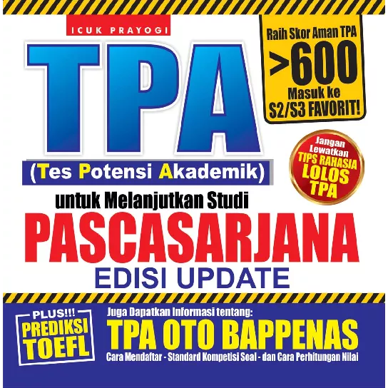 Model tes dan materi soal yang disajikan dalam buku ini merupakan pengayaan dari berbagai macam model tes Tujuan dari model model tes yang disajikan dalam buku ini adalah memperkenalkan model TPA untuk masyarakat umum yang hendak menempuhnya tentu setelah melampaui jenjang pendidikan S1 terlebih dahulu Dalam banyak kasus kegagalan menembus skor minimal TPA bukanlah karena rendahnya kemampuan si peserta tes melainkan karena ketidakbiasaan terhadap materi yang ada dalam tes Dengan mempelajari buku ini Anda dapat memperoleh pengalaman mengerjakan tes potensi akademik yang serupa dengan tes yang akan dilakukan saat S2 Dengan pengenalan soal dan sekaligus pemecahan jawaban Anda akan lebih menguasai TPA yang sesungguhnya karena kemampuan Anda merupakan gabungan dari kemampuan alami bakat dan pengalaman Saat ini TPA bukanlah model tes yang dirahasiakan lagi Masyarakat awam dapat mempelajari sendiri dan menambah pengalaman dari buku buku latihan TPA yang ada Ada pendapat yang mengatakan bahwa dalam menghadapi tes ada baiknya orang berlatih dan mengenali tes dengan baik terlebih dahulu sebelum mengerjakan tes yang sesungguhnya