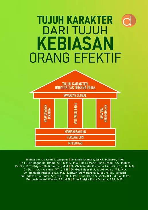 Buku ini merupakan buku ajar pembelajaran karakter yang lebih banyak mengacu pada tahapan implementasi untuk dapat memudahkan para pembaca terutama civitas akademika Universitas Dhyana Pura mengadopsi dan menerapkan Tujuh Karakter Undhira dalam kehidupan sehari hari Hal ini sangat berguna dalam memudahkan dalam mencapai Visi Universitas Dhyana Pura yaitu Perguruan Tinggi Teladan dan Unggulan yang mampu membentuk sumber daya manusia berdaya saing di tingkat nasional maupun global Buku ini juga perwujudan dari amanah Statuta Universitas Dhyana Pura untuk melaksanakan pembelajaran karakter sebagai bagian utama dalam mewujudkan Visi dan Misi Undhira Universitas Dhyana Pura telah menetapkan 7 karakter yang diharapkan dapat dijadikan dasar berpikir berkata dan bertindak dalam segala program yang direncanakan oleh setiap civitas akademika Tujuh karakter adalah sebagai berikut Integritas Percaya diri Kewirausahaan Merawat keberagaman Profesionalitas Kepemimpinan melayani Wawasan global