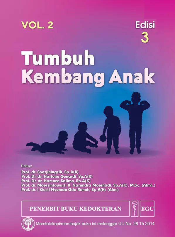 Akhir akhir ini semakin banyak penyakit yang muncul seiring dengan kemajuan teknologi atau zaman Permasalahan yang muncul dalam lingkup tumbuh kembang anak saat ini semakin kompleks sehingga diperlukan literatur yang memadai Buku Tumbuh Kembang Anak Edisi 3 ini membahas lebih banyak topik dibandingkan dengan edisi sebelumnya dengan penambahan sejumlah kontributor dan editor ahli berpengalaman yang tersebar di seluruh Indonesia Buku ajar komprehensif ini terbagi menjadi 2 volume yang saling berkesinambungan dengan pembahasan topik yang lebih mendalam lengkap dan relevan dengan kondisi saat ini Tumbuh Kembang Anak Edisi 3 Volume 2 berisi 7 bagian yaitu Kondisi medis Anak usia prasekolah dan sekolah Masa remaja Imunisasi Perlindungan anak Kesehatan sekolah Pediatri komunitas