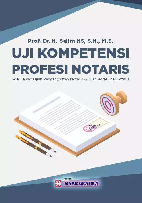 Buku Uji Kompetensi Profesi Notaris Soal Jawab Ujian Pengangkatan Notaris Ujian Kode Etik Notaris merupakan satu satunya buku di Indonesia yang menyajikan secara holistik tentang materi soal jawab tentang ujian pengangkatan notaris dan ujian kode etik notaris Buku ini memberikan gambaran secara umum tentang materi ujian yang akan diujikan oleh panitia ujian yang telah menetapkan dua macam materi ujian berupa pilihan berganda dengan bobot 40 dan pembuatan akta dengan bobot 60 Buku ini terdiri atas 13 tiga belas bab yang meliputi Bab 1 tentang Pendahuluan Bab 2 tentang Organisasi Kelembagaan Kementerian Hukum dan Hak Asasi Manusia Bab 3 tentang Pengangkatan Notaris Perpindahan Notaris Perpanjangan Masa Jabatan Notaris Pemberhentian Notaris Pengawasan dan Pembinaan terhadap Notaris Bab 4 tentang Perjanjian Bernama Tidak Bernama Legalisasi dan Waarmerking Bab 5 tentang Pendirian dan Perubahan Anggaran Dasar Badan Hukum Perseroan Terbatas Yayasan dan Perkumpulan Bab 6 tentang Jaminan Kebendaan dan Jaminan Perorangan Bab 7 tentang Pendaftaran Jaminan Fidusia Bab 8 tentang Hukum Waris Perdata dan Wasiat Bab 9 tentang Kepailitan Bab 10 tentang Sikap dan Perilaku Notaris Bab 11 tentang Materi Ujian Undang Undang Jabatan Notaris UUJN Bab 12 tentang Materi Ujian Pembuatan Akta dan Bab 13 tentang Materi Ujian Kode Etik Notaris UKEN Buku ini diperuntukkan bagi mahasiswa Prodi Magister Kenotariatan seluruh Indonesia calon notaris yang akan mengikuti Ujian Pengangkatan Notaris UPN dan Ujian Kode Etik Notaris UKEN serta mahasiswa Strata Satu Program Studi Ilmu Hukum seluruh Indonesia
