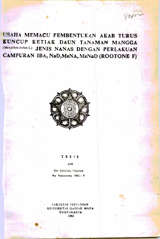 Usaha Memacu Pembentukan Akar Turus Kuncup Ketiak Daun Tanaman Mangga (Mangifera Indica L) Jenis Nanas Dengan Perlakuan Campuran Iba, Nad, Mena, Menad (Rootone F) Siti Sulistina Triastuti Fakultas Pertanian UGM Konten Lokal Konten Lokal 31070