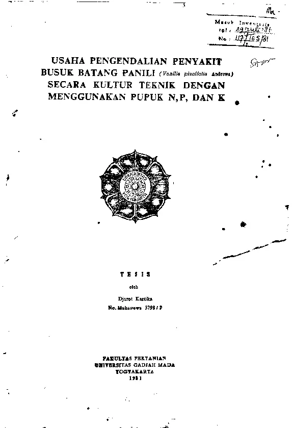 Usaha Pengendalian PenyakitBusuk Batang Panili(Vanilla Planifolia Andrews)Secara Kultur Teknik DenganMenggunakan Pupuk N,P, Dan K Djarot Kartika Fakultas Pertanian UGM Konten Lokal Konten Lokal 31369